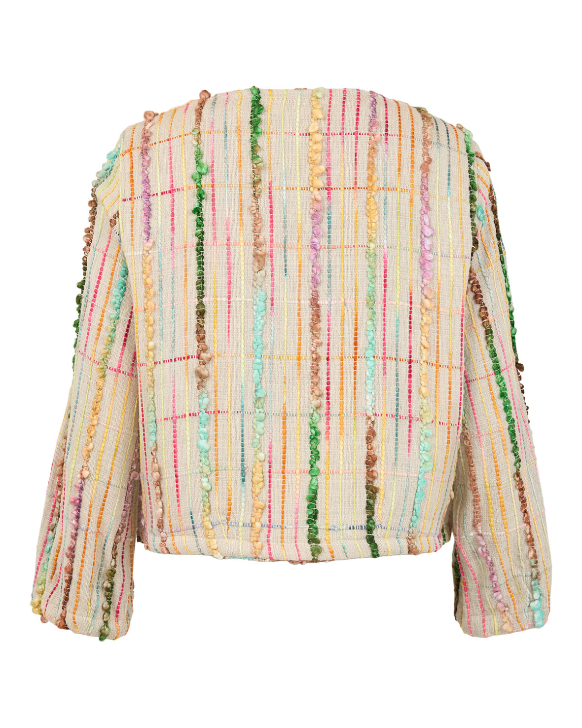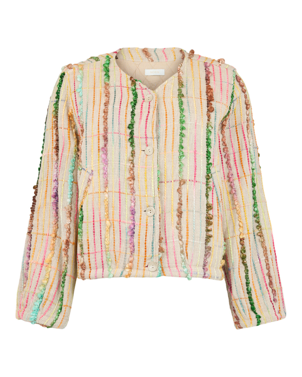 JAKKE 87178 - NOEN Fantastisk kort jakke syet i det fineste bomuldsstof med smukt farvet broderi der giver et unikt og iøjnefaldende udtryk. Den lette ballon facon og de rummelige ærmer skaber en flot silhuet som er nem at style både til kjoler og bukser. En virkelig smuk og anderledes jakke der løfter ethvert outfit.