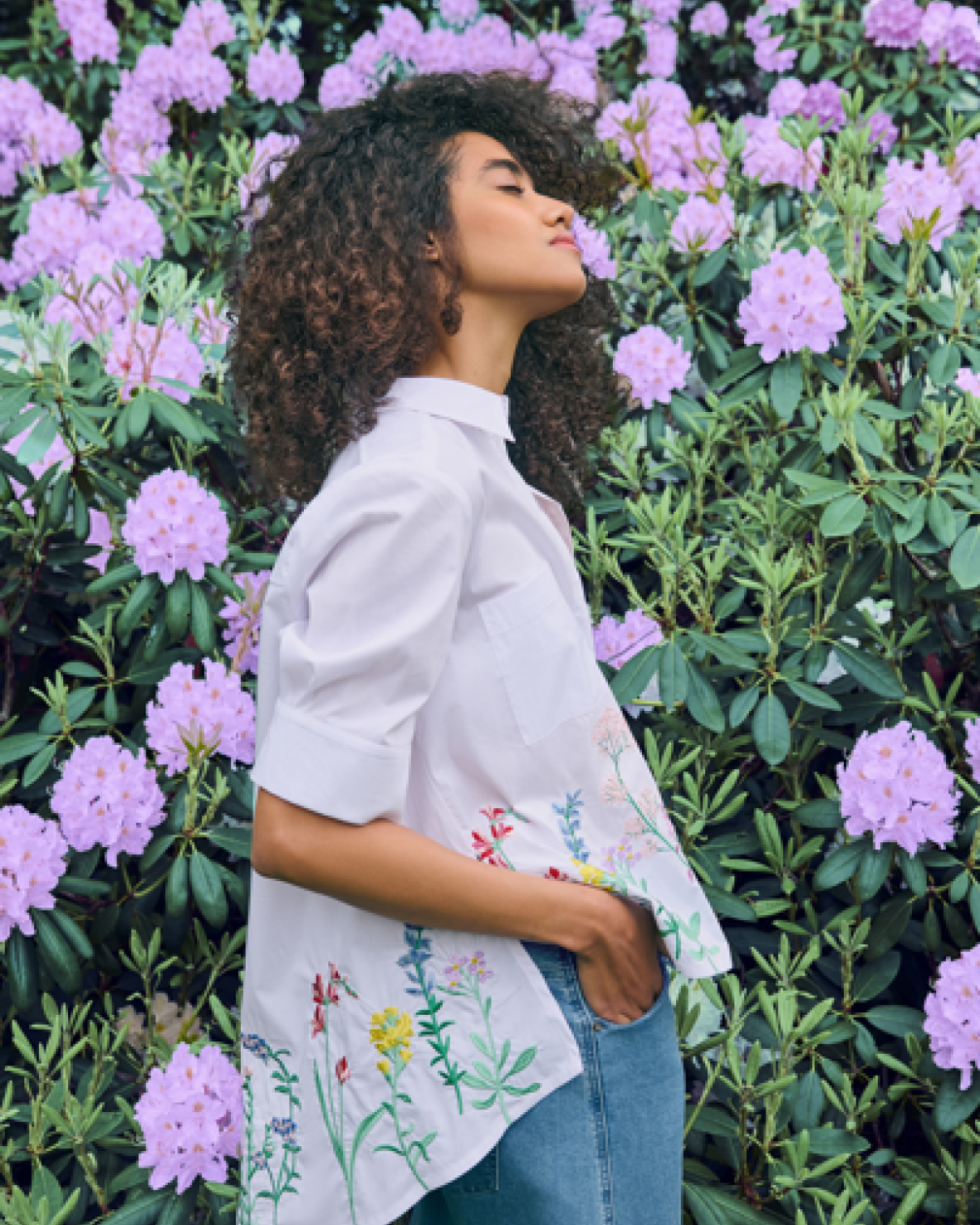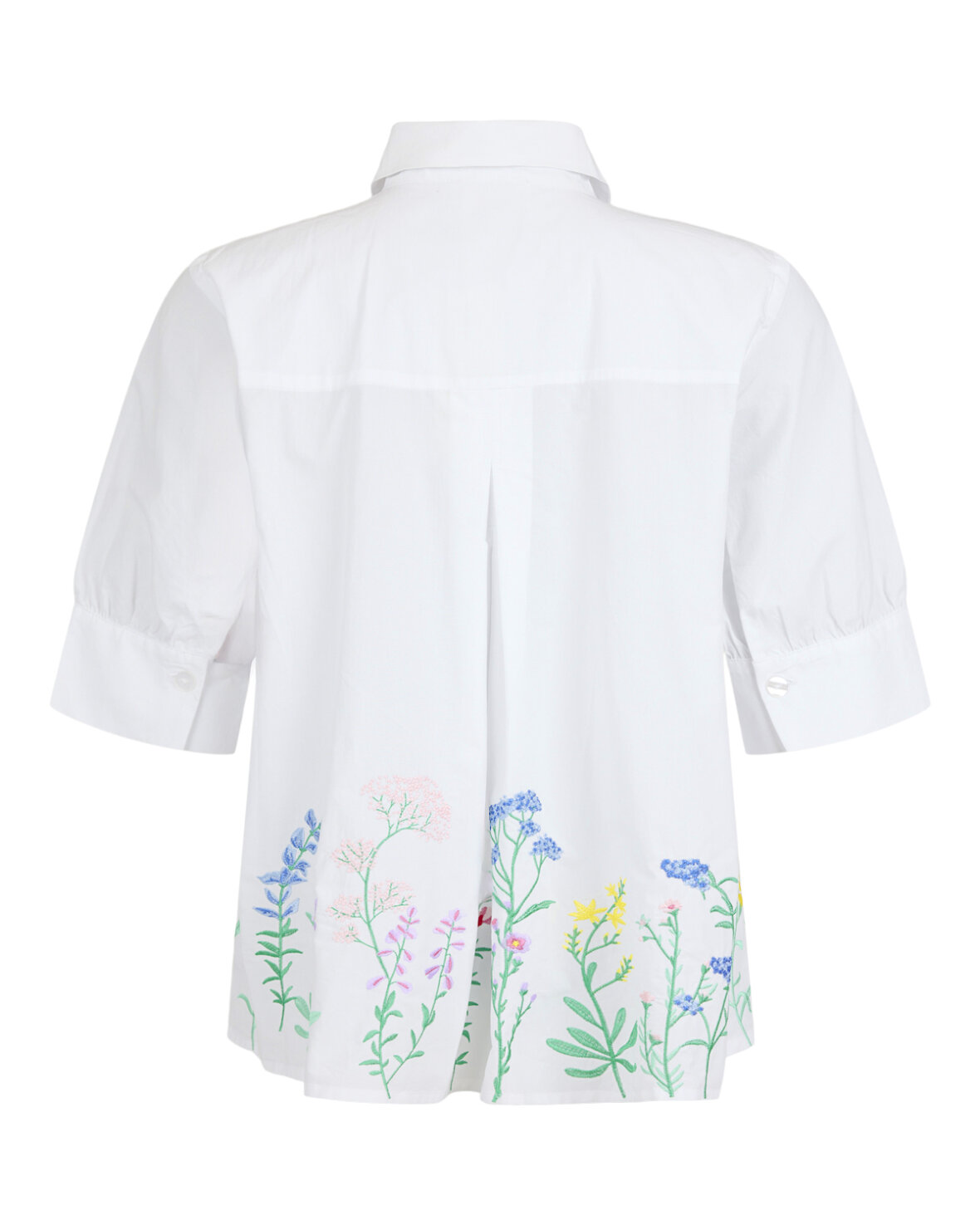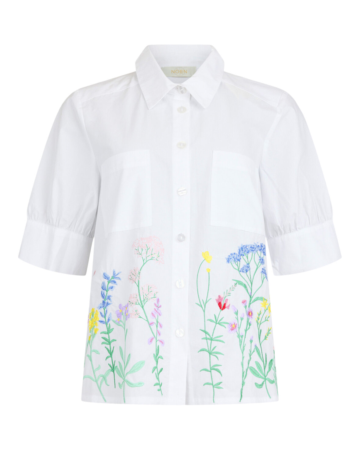 SKJORTE 86294 - NOEN Smuk bomuldsskjorte med vidde og det fineste blomsterbroderi der giver et feminint og levende udtryk. Den rummelige A facon falder let omkring kroppen, og de farverige broderier nederst gør skjorten helt særlig. En skøn skjorte der er nem at style til både hverdag og sommerlige anledninger.