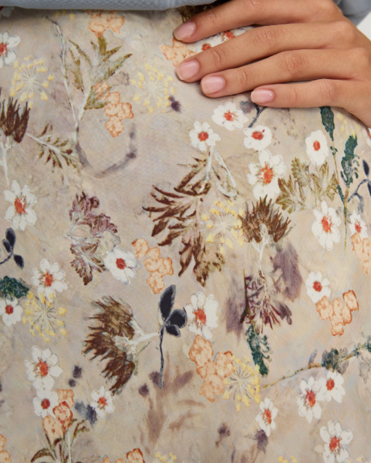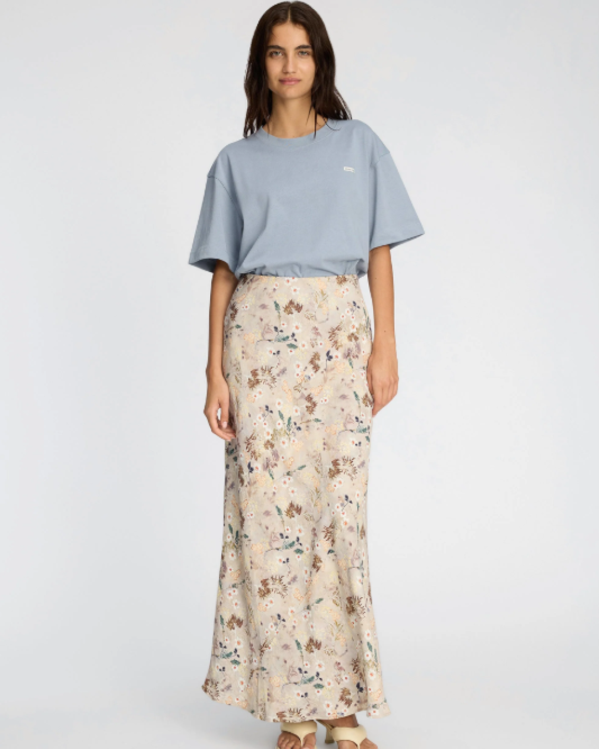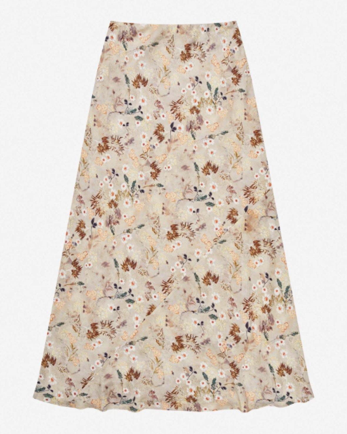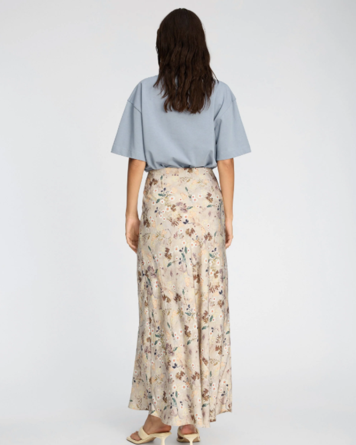 BARDOT NEDERDEL - MUNTHE Denne smukke nederdel har et naturprint med blomster, en lang, let silhuet og en glat overflade. Munthe har et mål om at producere printede styles med et minimum af materiale spild. Det betyder, at hver style er forskellige i forhold til hvordan mønsteret er placeret, og alle printede styles er derfor unikke.