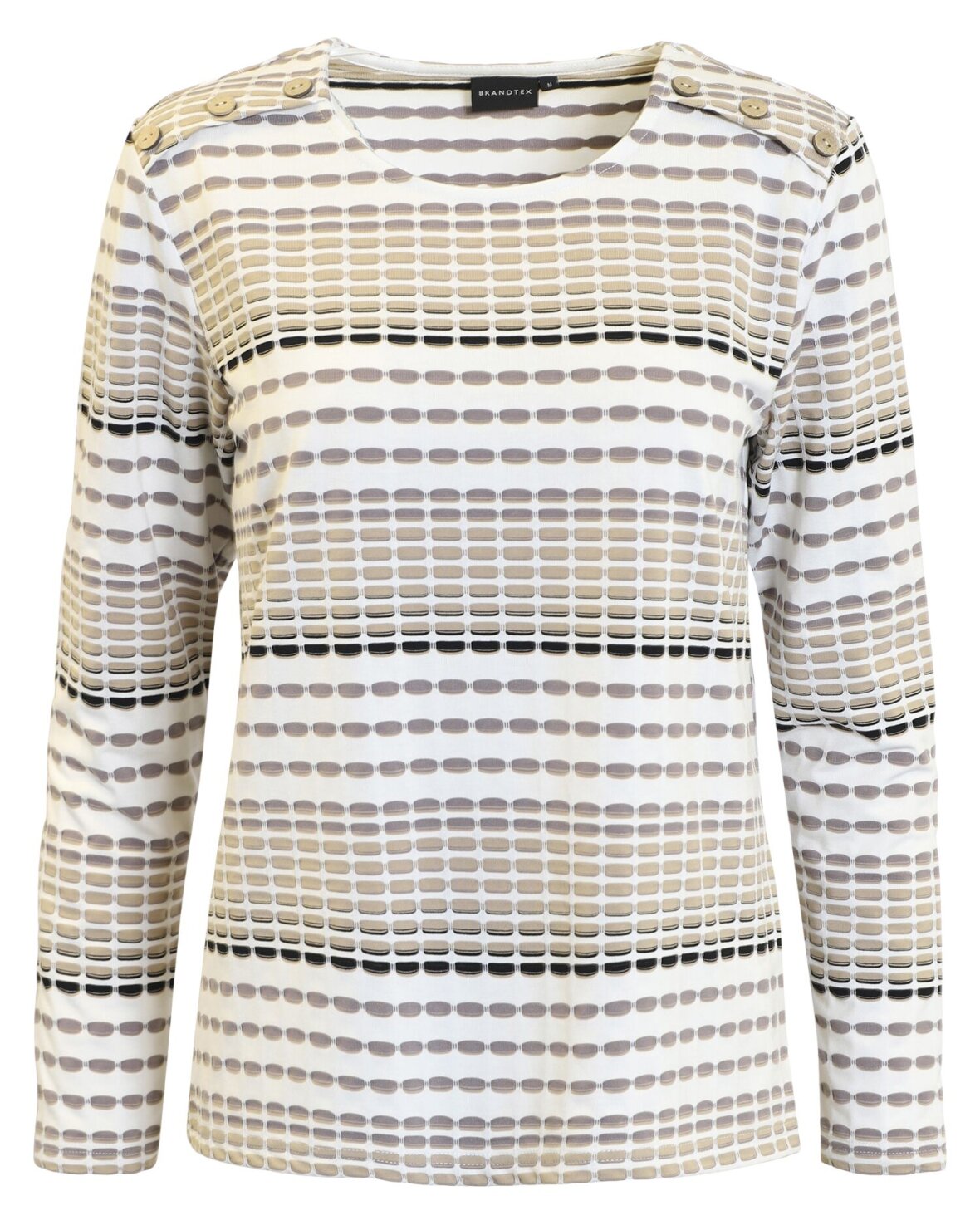 T.SHIRT 219955-BRANDTEX har en klassisk rund halsudskæring og lange ærmer, som gør den ideel til både overgangsperioder og som et let lag under en cardigan eller blazer. På skuldrene er der dekorative knapper, som tilføjer et feminint og eksklusivt touch til designet. Pasformen er behagelig og flatterende, så den falder pænt på kroppen uden at stramme.Kvalitet: 65%Viskose, 32%Polyester, 3% Elastan
