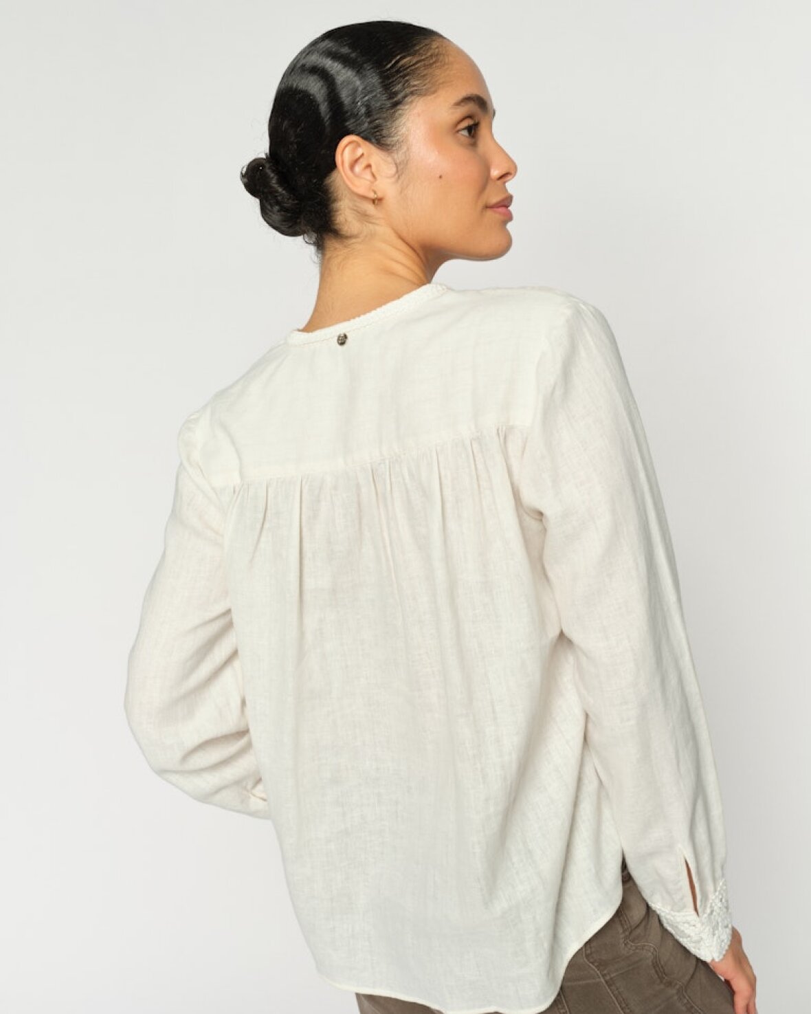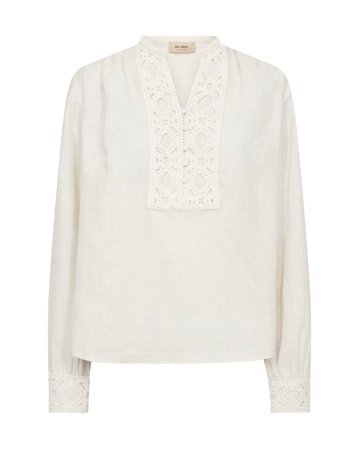 MMEVENDA IS BLOUSE - MOS MOSH En smukt detaljeret bluse fremstillet i en blød hør-bomuldsblanding. Den er designet i en afslappet silhuet med fine broderie anglaise-detaljer ved halsudskæring og manchetter, som tilfører et strejf af elegance til den naturlige struktur. Style den med skræddersyede bukser eller denim for et raffineret, men ubesværet look.