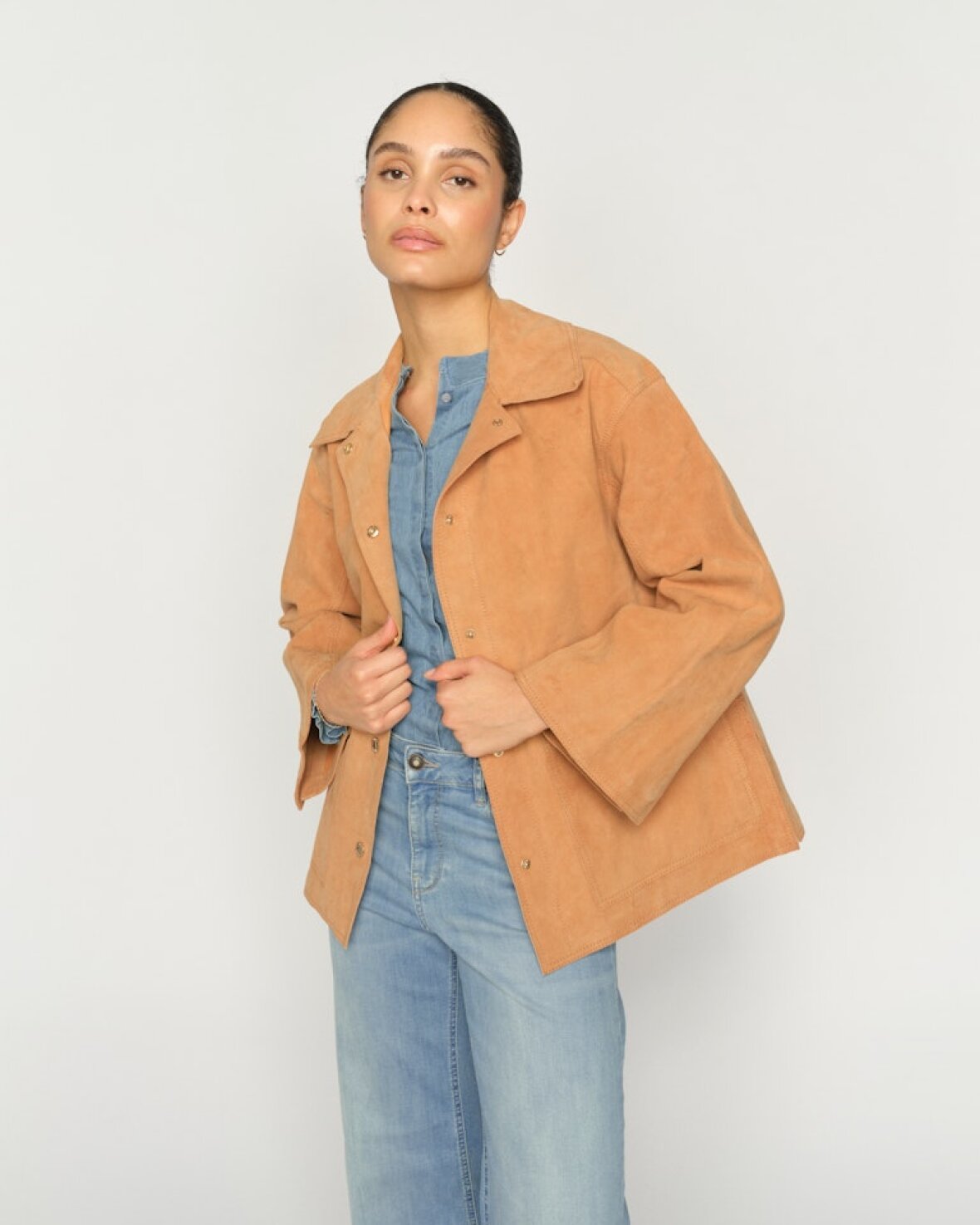 MMJUSTINA SUEDE JACKET - MOS MOSH er en tidløs ruskindsjakke fremstillet i 100 % gedeskind. Den er designet med klassisk krave, knaplukning og påsyede frontlommer. Den afslappede silhuet tilfører et ubesværet sofistikeret touch til ethvert look.