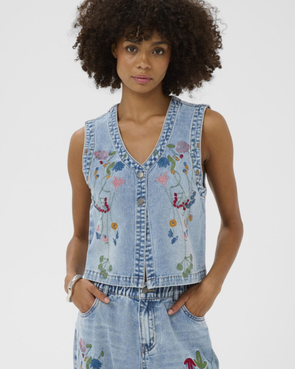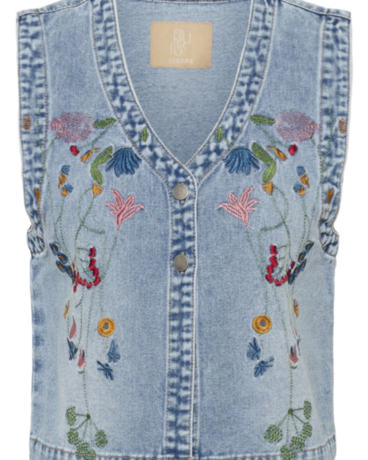 CUTIALA ANICETA EMBROIDERY WAI er en smart denimvest med V-udskæring og broderede blomster, kort og lige pasform. Metaltrykknapper og ærmeløst design giver et stilsikkert look.Kvalitet: 95% Bomuld, 5% Polyester
