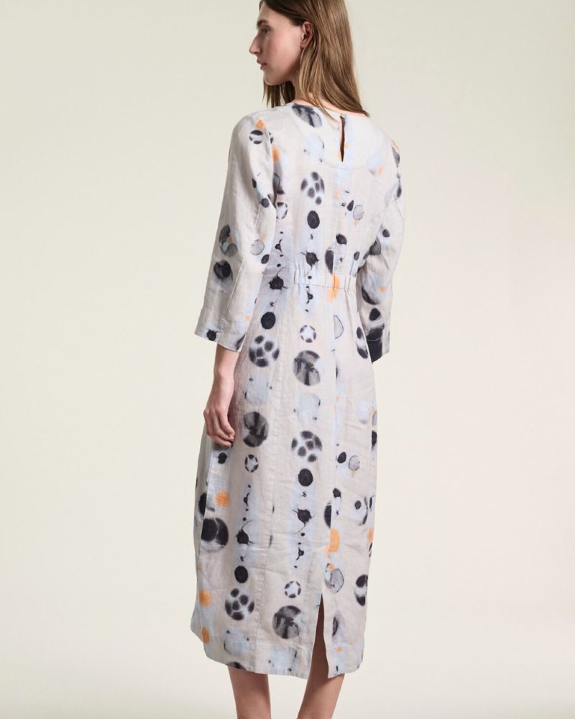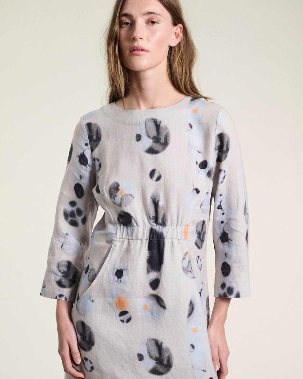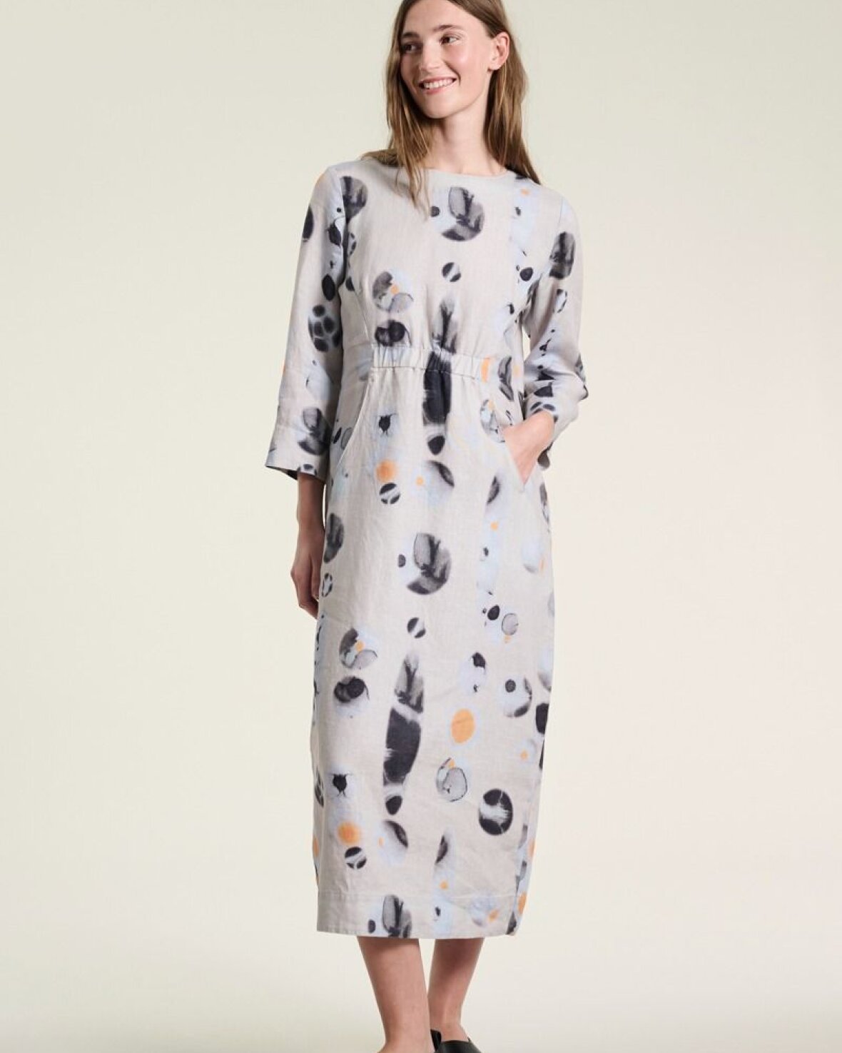 KJOLE 14995 - BITTE KAI RAND En lang hørkjole med markeret talje og enkle linjer, der skaber en smuk silhuet. Snittet er enkelt og lader det smukke print tale for sig selv. En kjolen, der er flot i al sin enkelhed uden tilbehør. Du kan også vælge at kombinere den med den matchende Hikazu jakke og på den måde få et gennemført og opsigtsvækkende sæt.