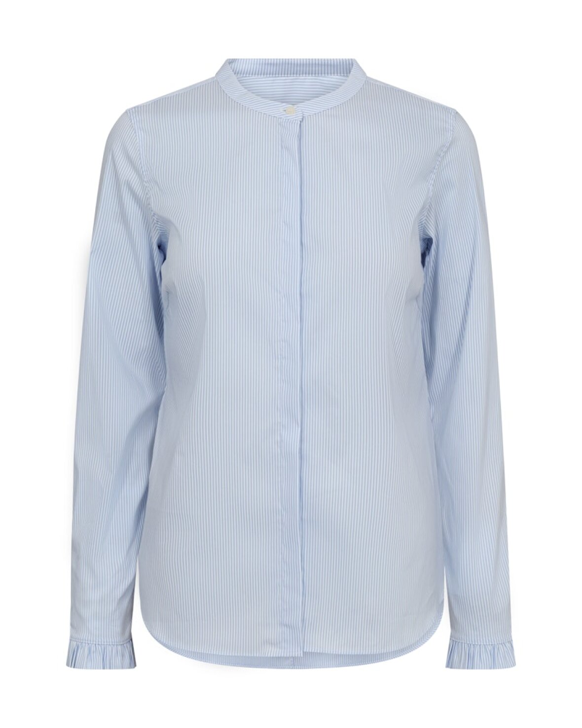 MMMATTIE STRIPE SHIRT - MOS MOSH En klassisk stribet skjorte med et moderne twist. Den er designet i en regular pasform med båndkrave, knaplukning og lange ærmer med fine flæsedetaljer ved manchetterne. Den rene silhuet og det fine stribemønster gør den til en alsidig garderobefavorit – perfekt sammen med jeans eller skræddersyede bukser for et poleret hverdagslook.