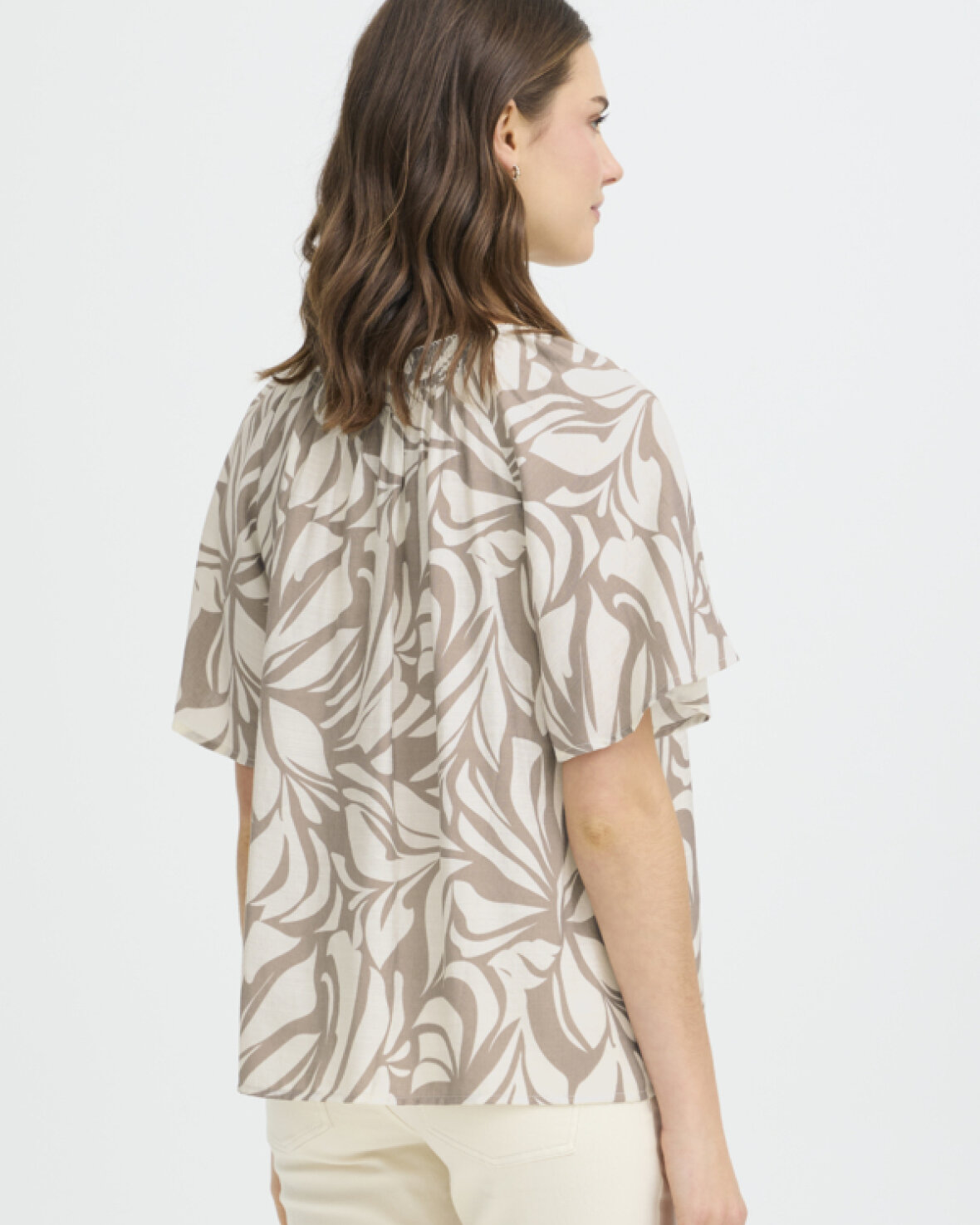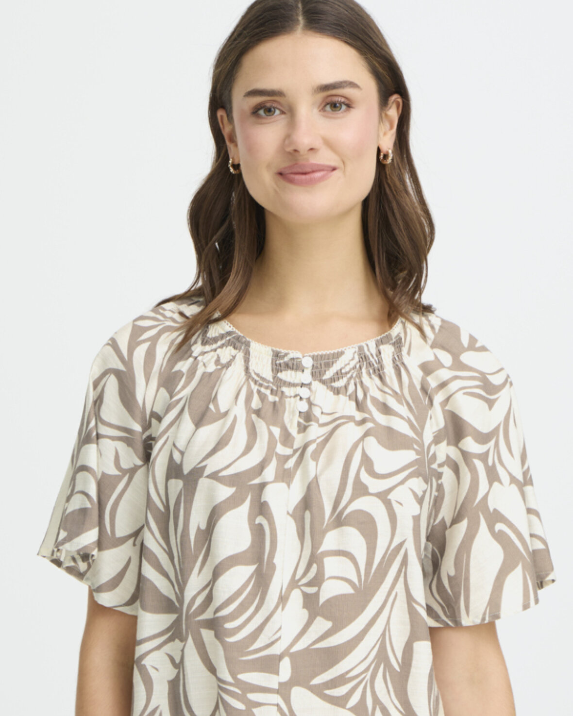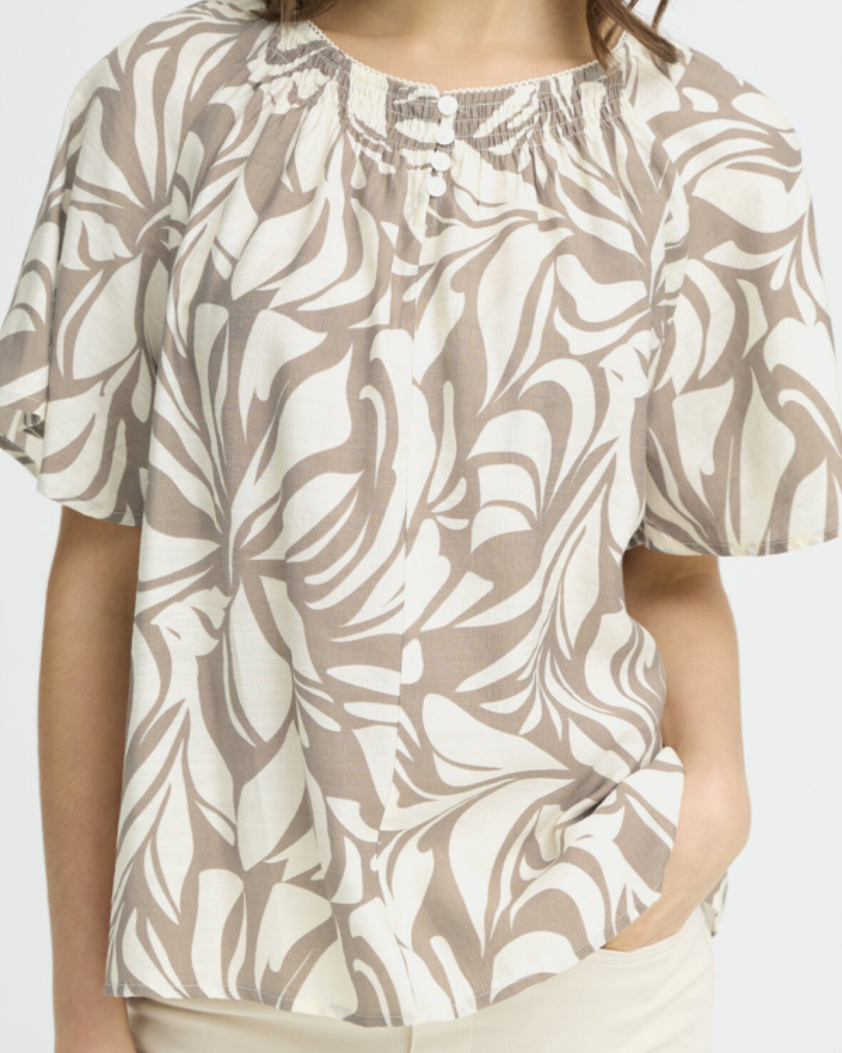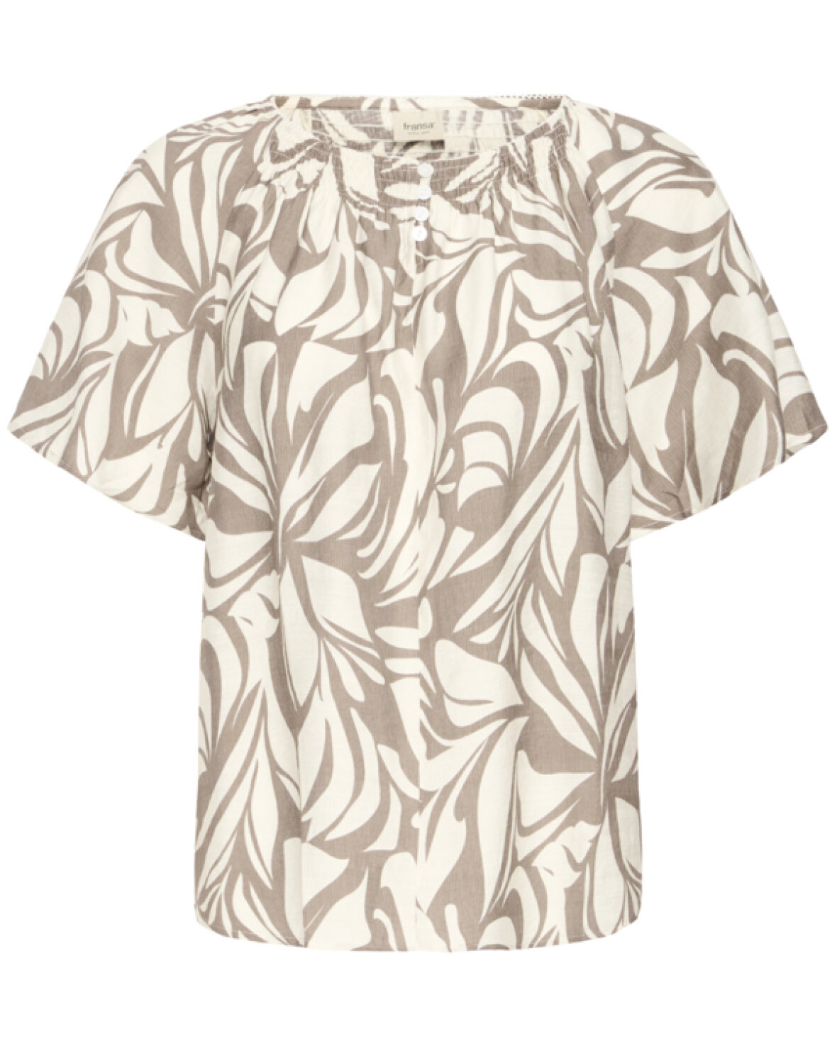 FRARINA BLUSE 16 - FRANSA Løs bluse med korte brede ærmer og rund hals med rynk og knapdetalje foran. Afslappet silhuet med let drapering.Kvalitet: 80% Viskose, 20% Polyamid