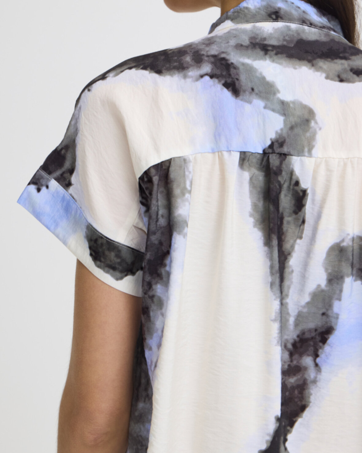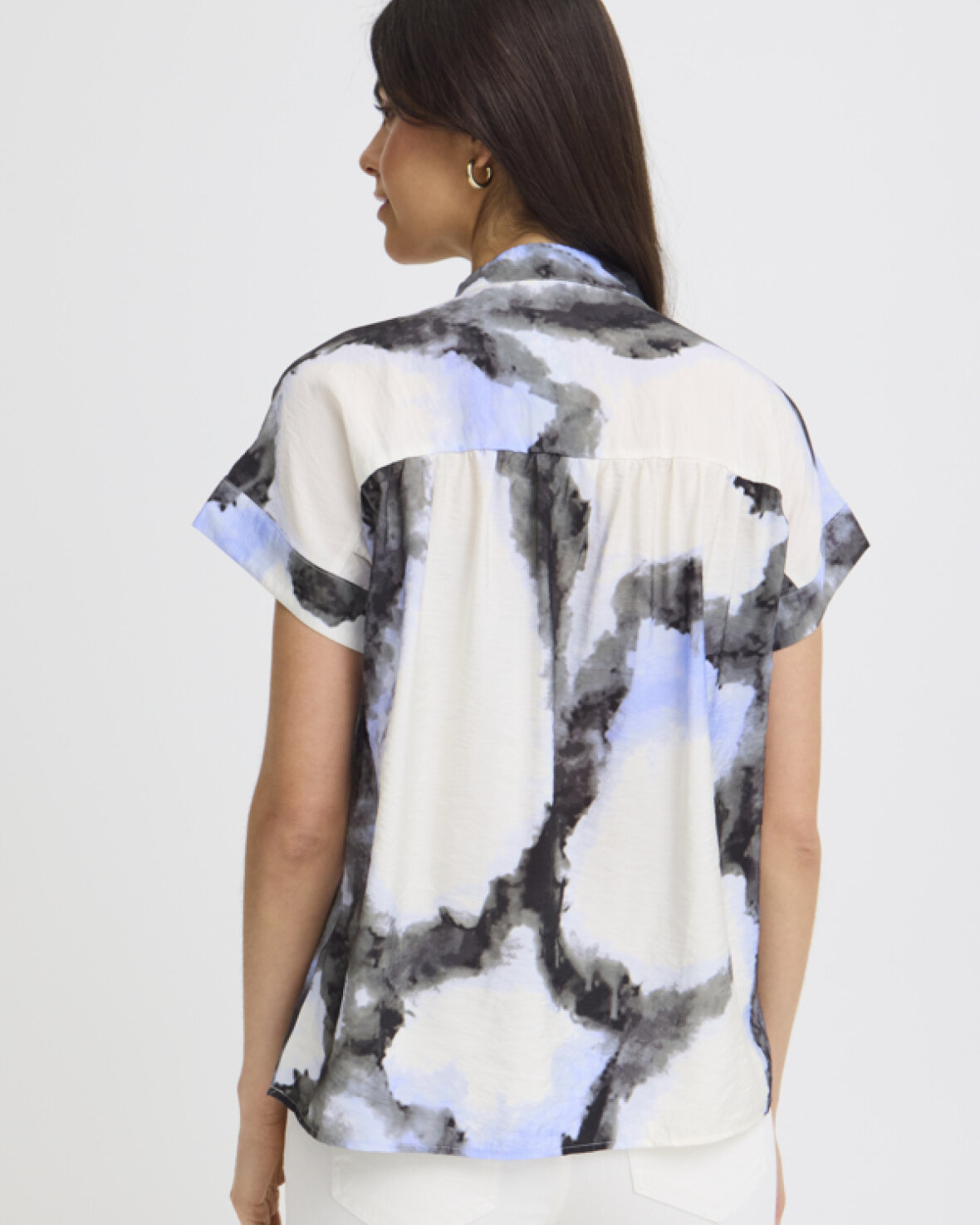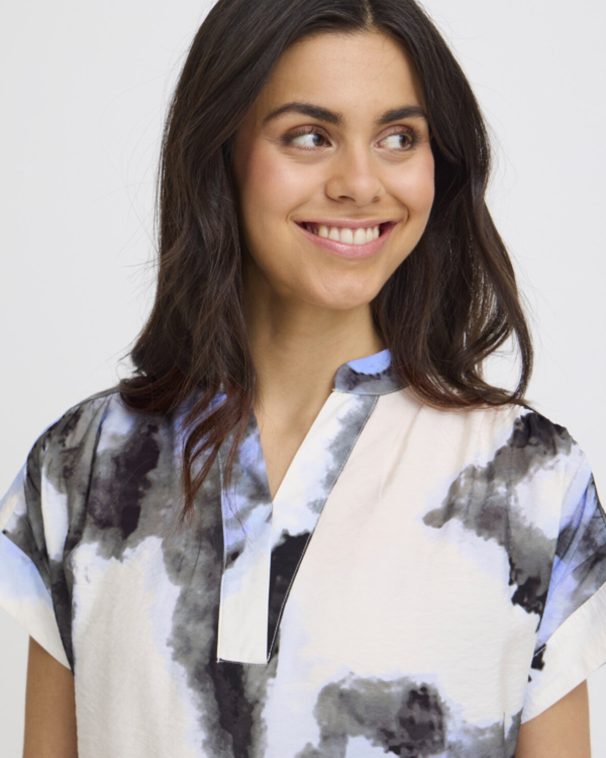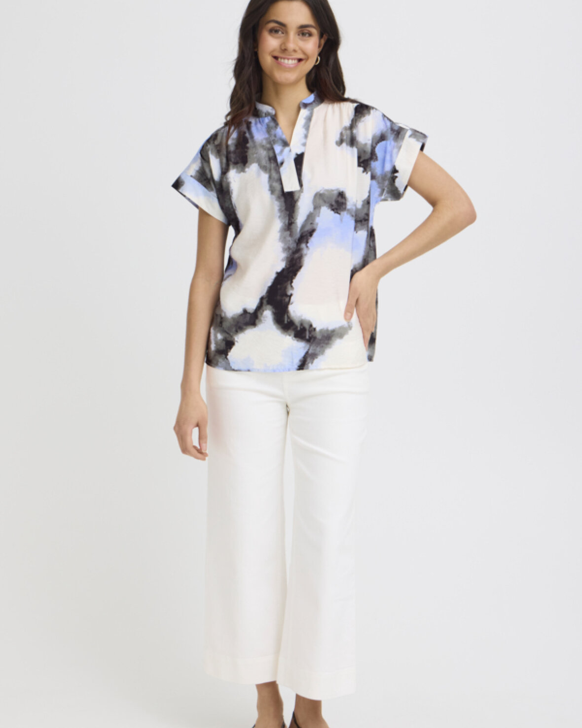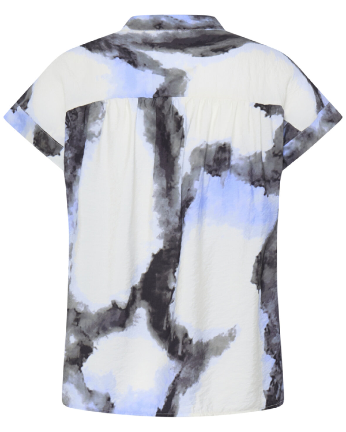 FRAYLA BL 1 BLUSE FRANSA Kortærmet bluse med abstrakt mønster, afslappet lige pasform og åben kinakrave. Det bløde tekstur giver et moderne, cool look.Kvalitet: 83% Viskose, 17% Nylon