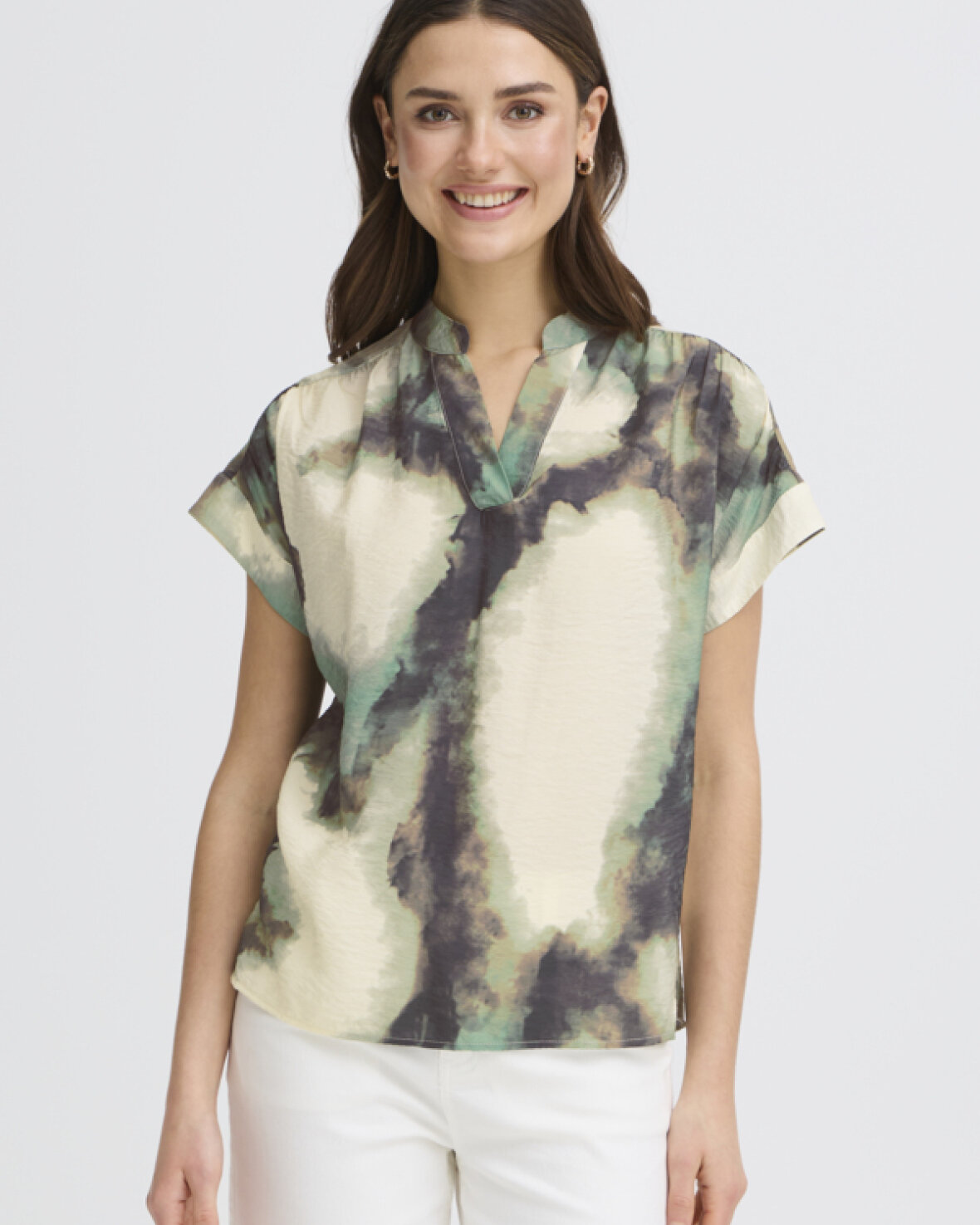 FRAYLA BL 1 BLUSE FRANSA Kortærmet bluse med abstrakt mønster, afslappet lige pasform og åben kinakrave. Det bløde tekstur giver et moderne, cool look.Kvalitet: 83% Viskose, 17% Nylon