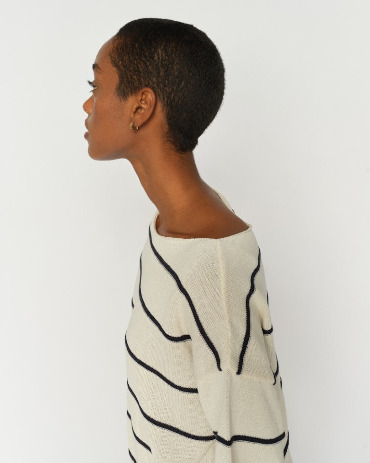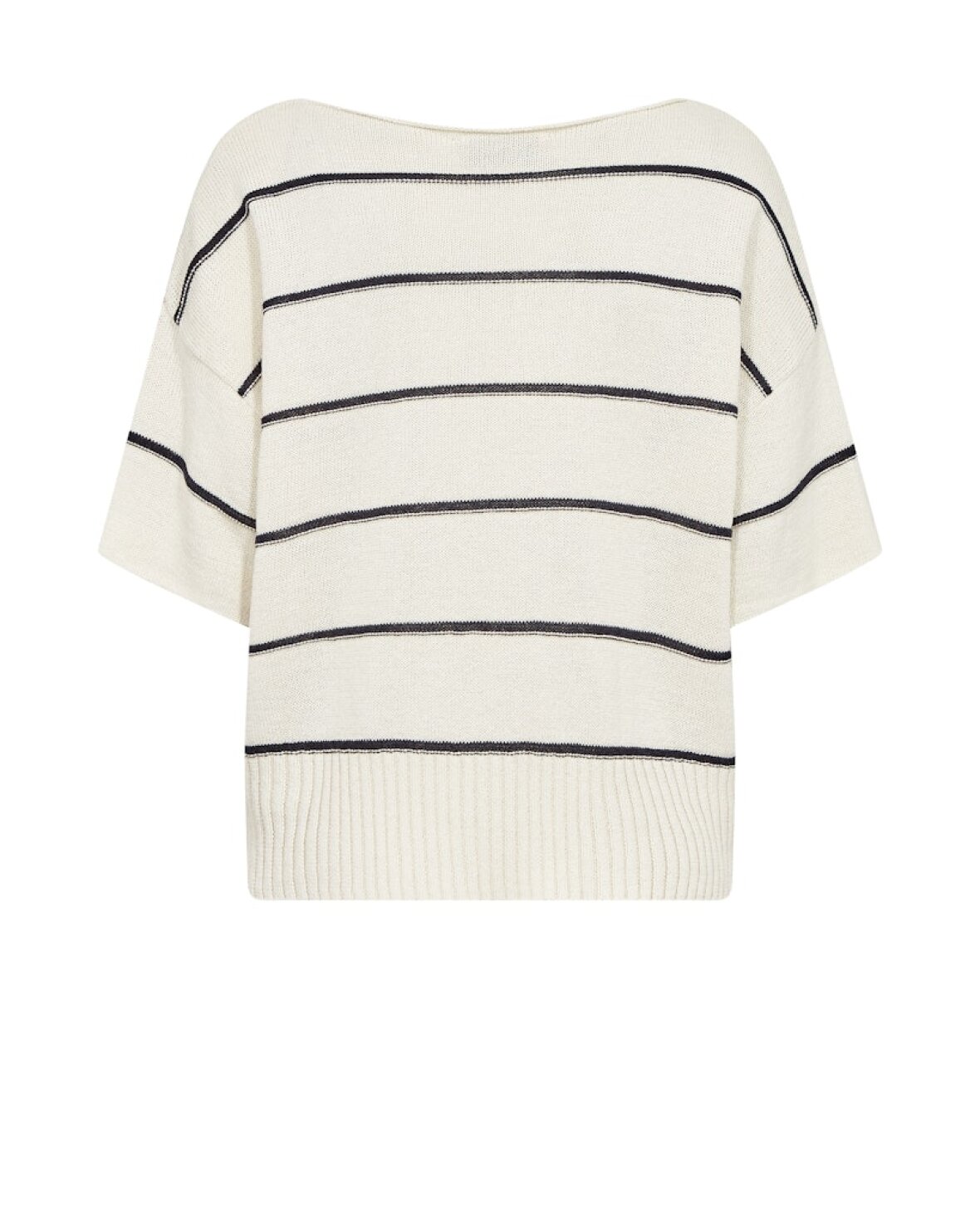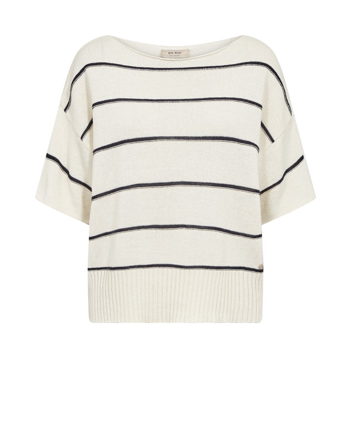 MMARLAN PAPER SS KNIT - MOS MOSH er en lækker let kortærmet strik med moderne bådudskæring og horisontalt stribemønster. Den giver en afslappet silhuet og en luftig struktur – perfekt til ubesværet, hverdagslig elegance.