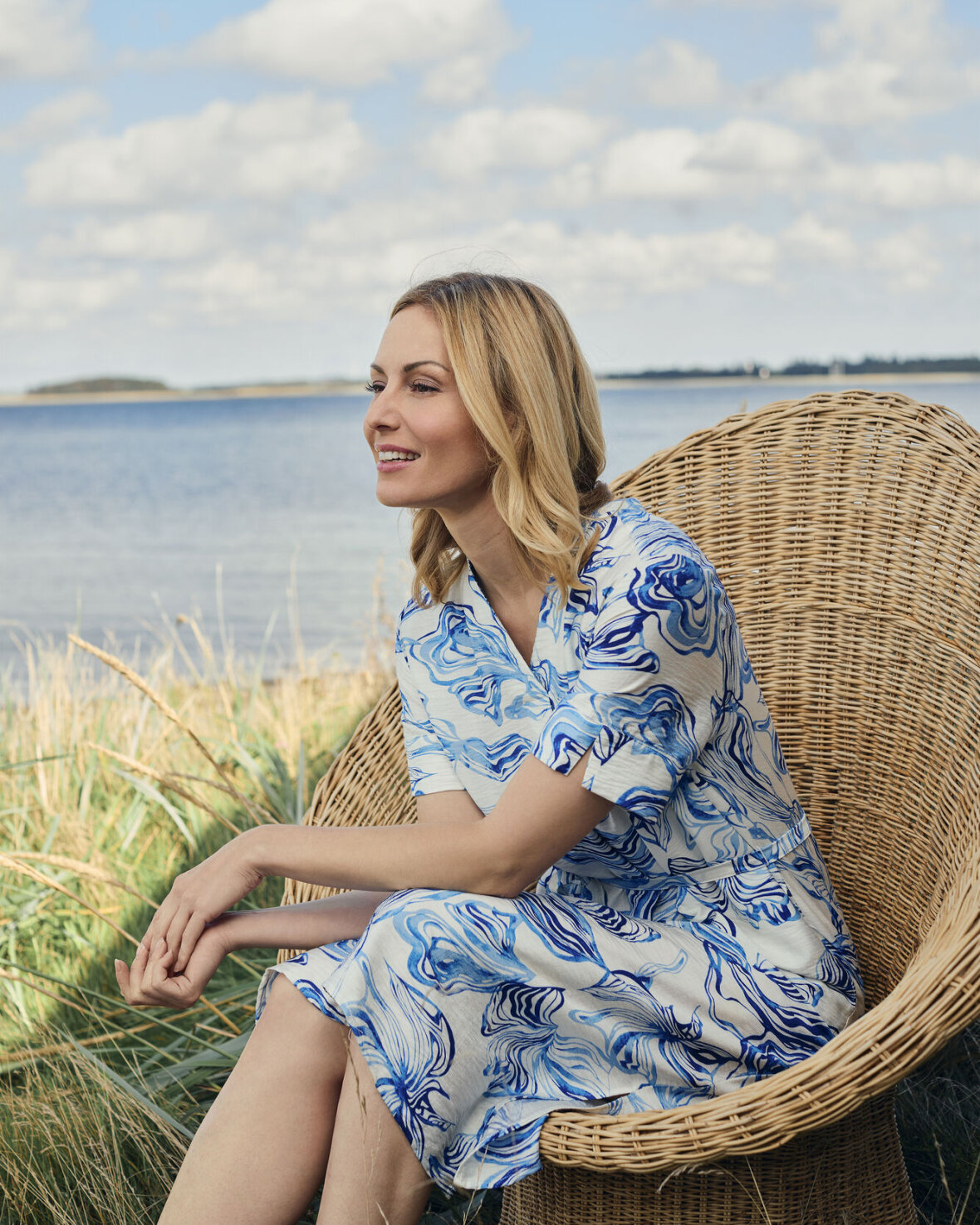 KJOLE 220404 - BRANDTEX er en smart kjole, der kombinerer stil og komfort med et skønt print. Den har korte ærmer, der giver en let og luftig fornemmelse, perfekt til varme dage. Det elegante bindebælte fremhæver taljen og tilføjer et feminint touch.Kvalitet: 85% Viskose og 15% Polyamid.