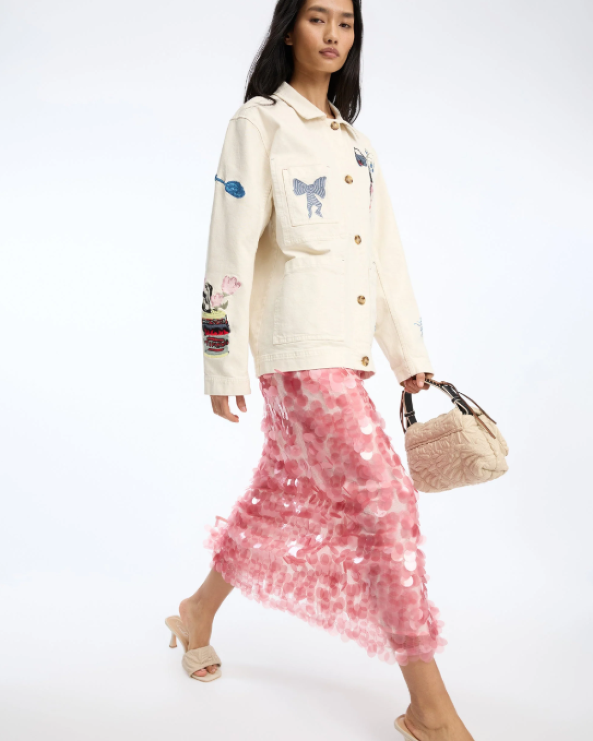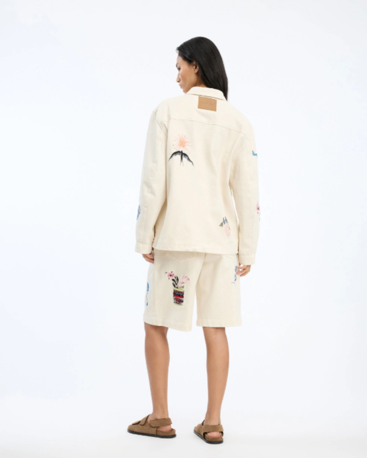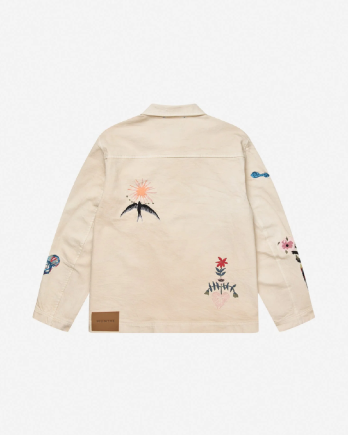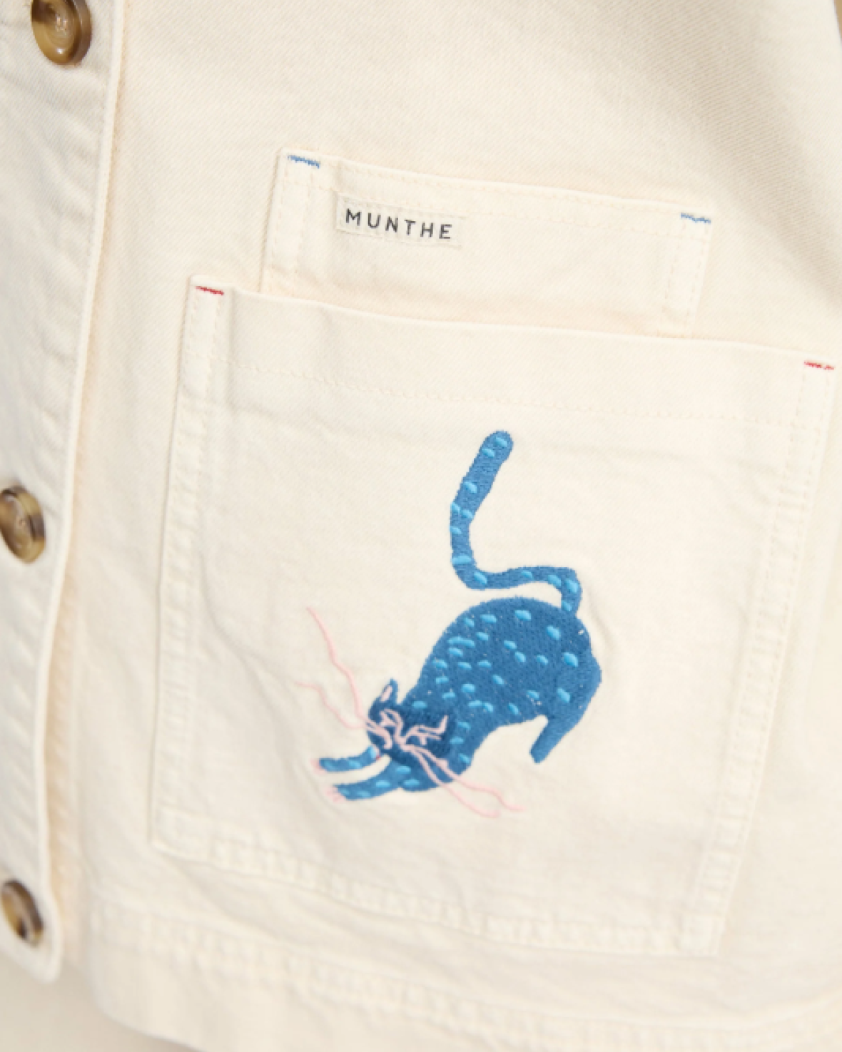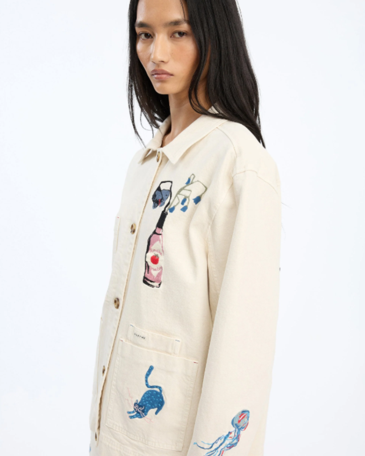 BRAULIA JAKKE - MUNTHE er en smart jakke i en løs, afslappet pasform, med knaplukning og store frontlommer. Dekoreret med flere broderede motiver som en sløjfe, en blå kat, en blomsterflaske og små håndtegnede detaljer på ærmerne.