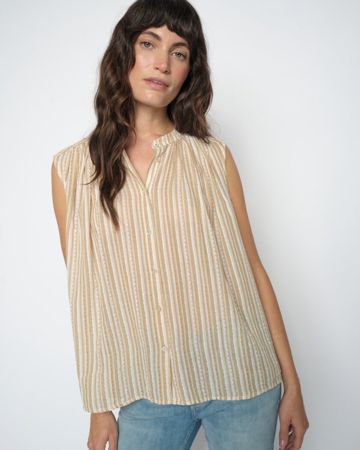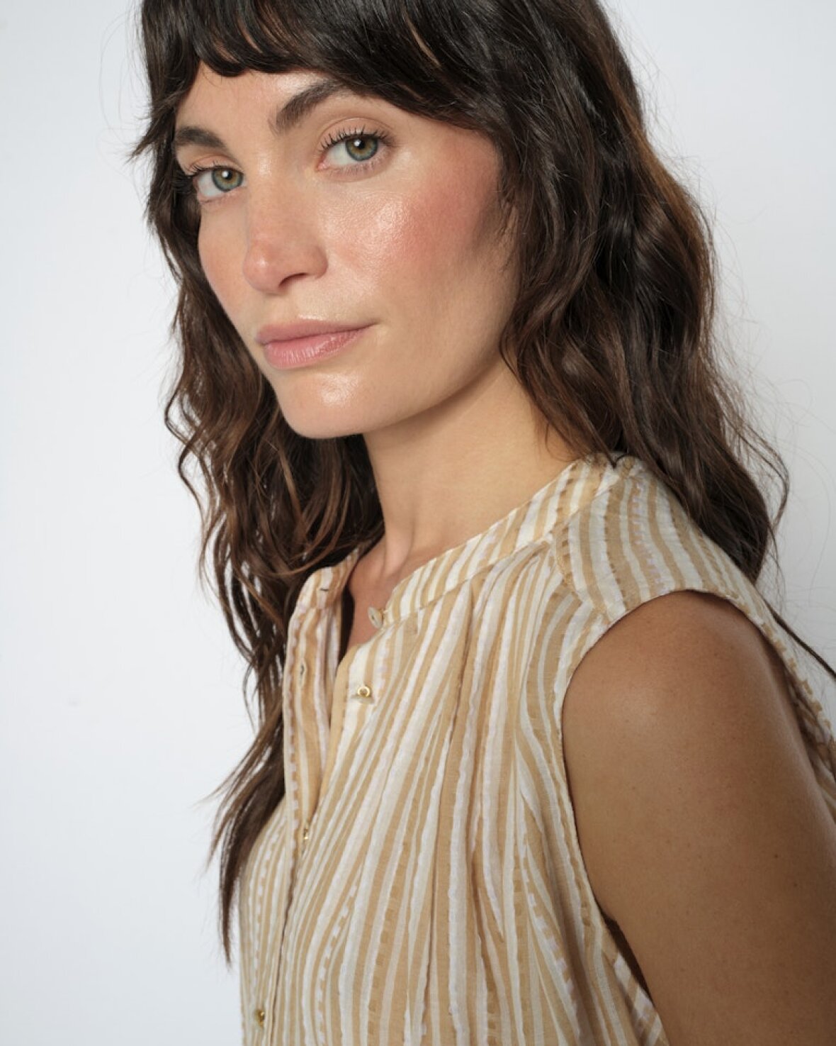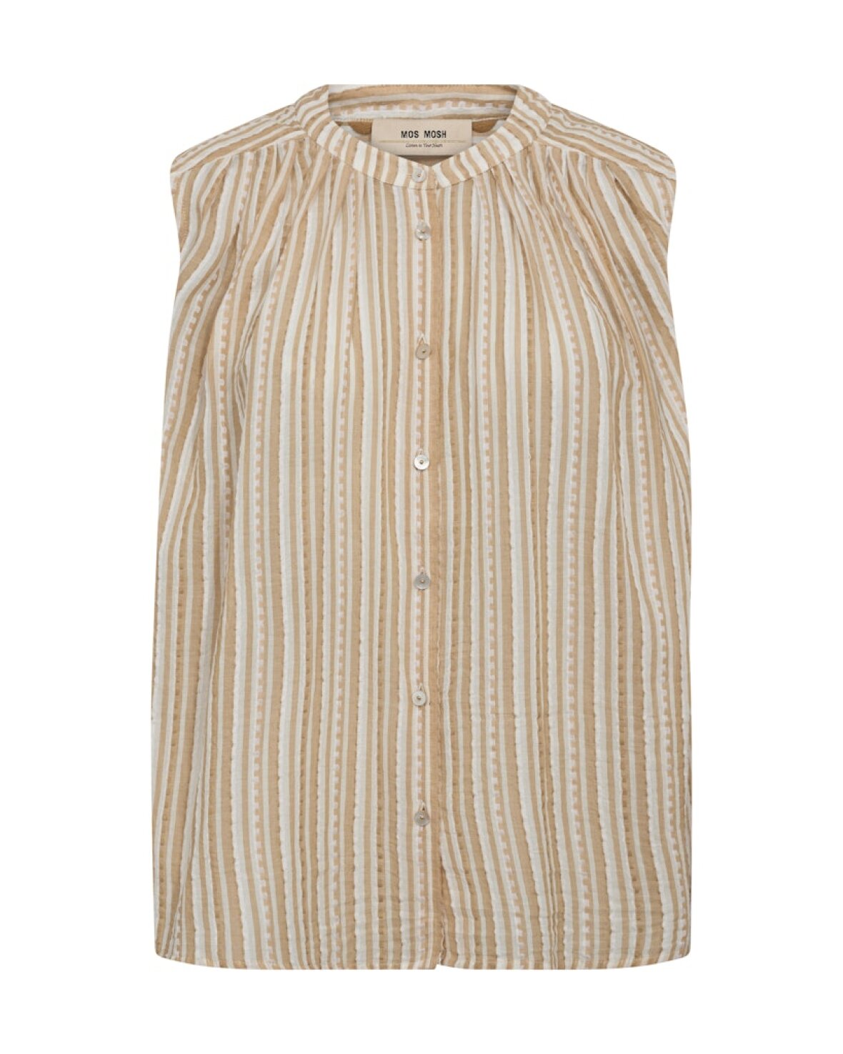MMAMELIA STRIPE SL BLOUSE - MOS MOSH er en let og elegant ærmeløs skjorte med fine striber i varme nuancer. Det luftige materiale og den løse pasform gør den perfekt til varme dage, hvor komfort og stil går hånd i hånd. De klassiske knapper og den enkle krave giver et tidløst udtryk, som gør den nem at style – både til afslappede hverdagslooks og mere feminine outfits.